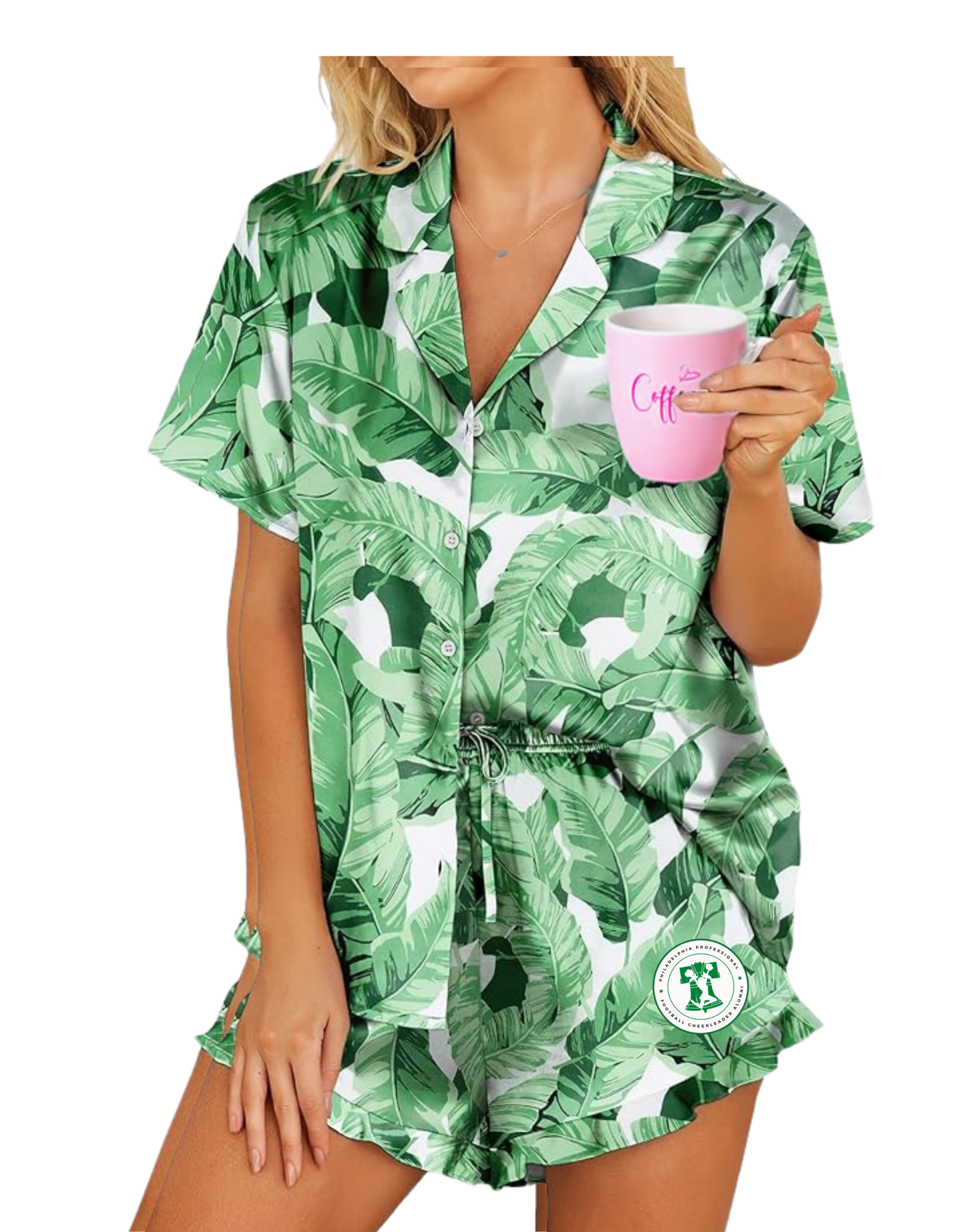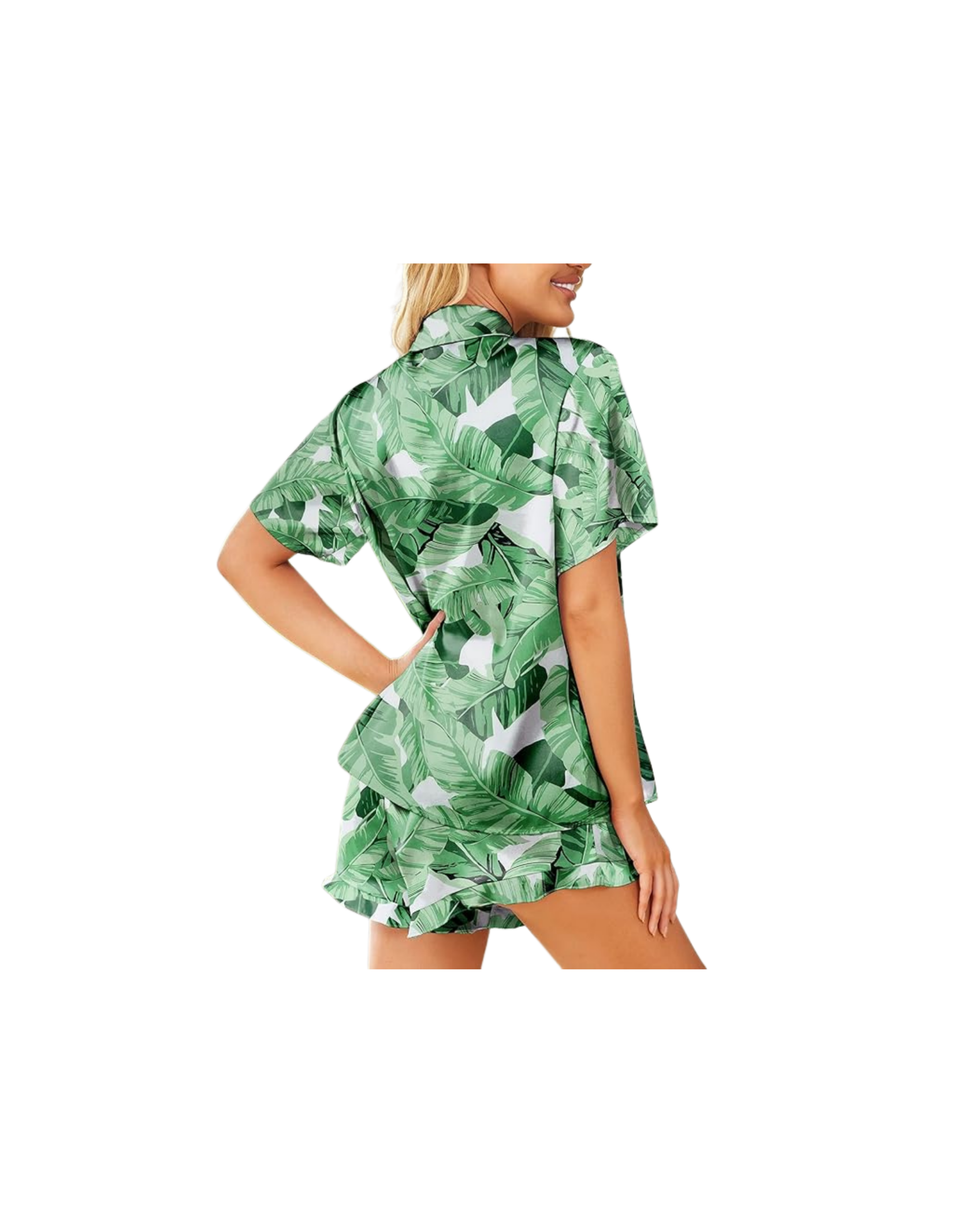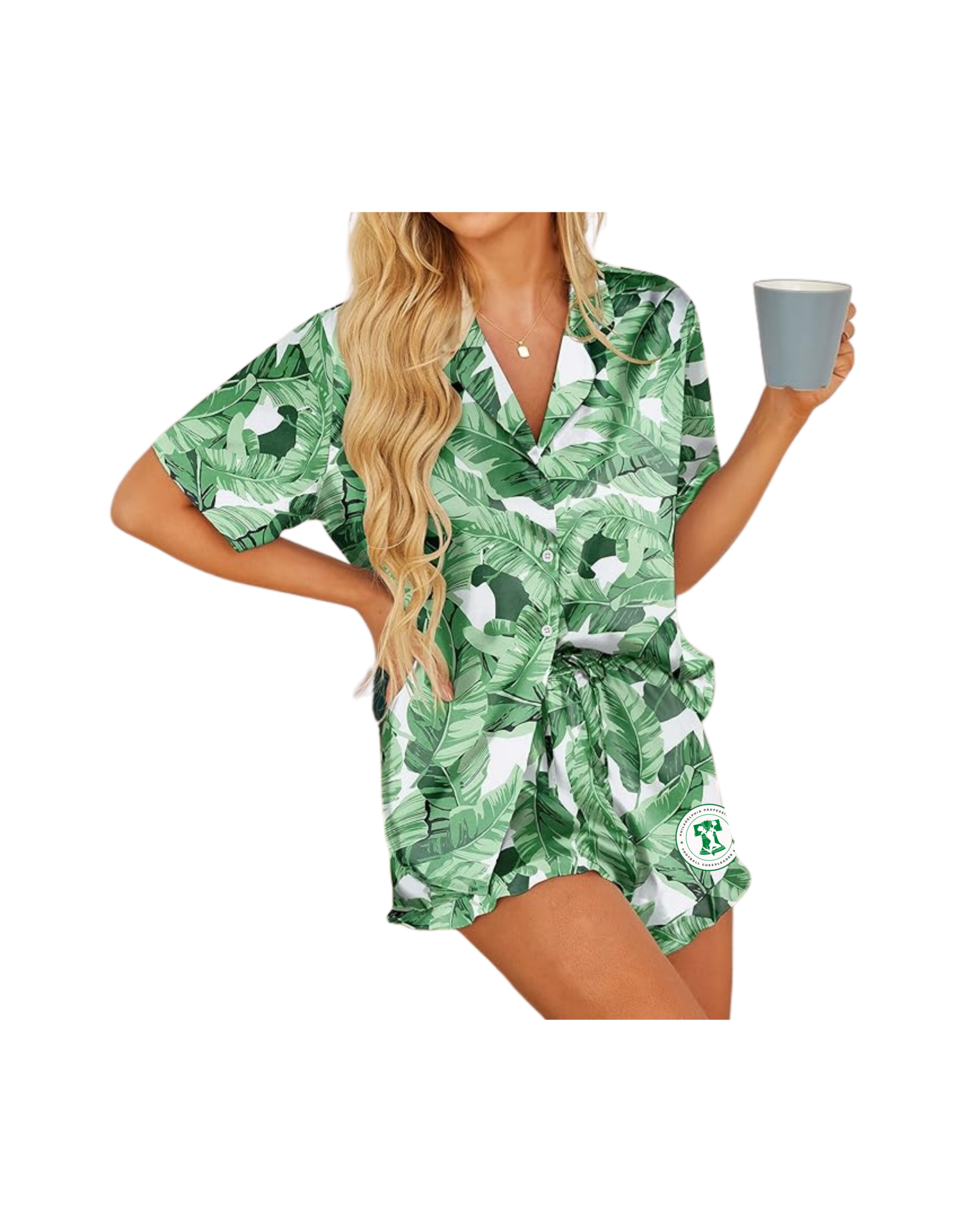 - 2 Piece Satin Pajama Set Featuring Relaxed Style, Short Sleeve, Classic Notch Collar, Full Button Design is easy to put on and take off. Cute Print Pj Set With Elastic Waist Contrast Trim Pajama Shorts will give you more comfortable and freedom feeling when you wear it.